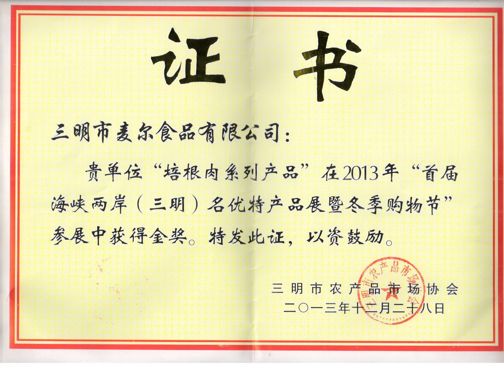 2013年12月14日—23日,三明市農(nóng)產(chǎn)品市場協(xié)會(huì) 在下洋廣場舉辦“首屆海峽兩岸(三明)名優(yōu)特產(chǎn)品暨冬季購物節(jié)”活動(dòng)。在參展會(huì)上,我司參展的培根、牛仔骨、豬頸肉、咸豬手、脆口條等系列產(chǎn)品受到顧客的好評(píng),在三明市農(nóng)產(chǎn)品市場協(xié)會(huì)組織的評(píng)審中榮獲金獎(jiǎng)。